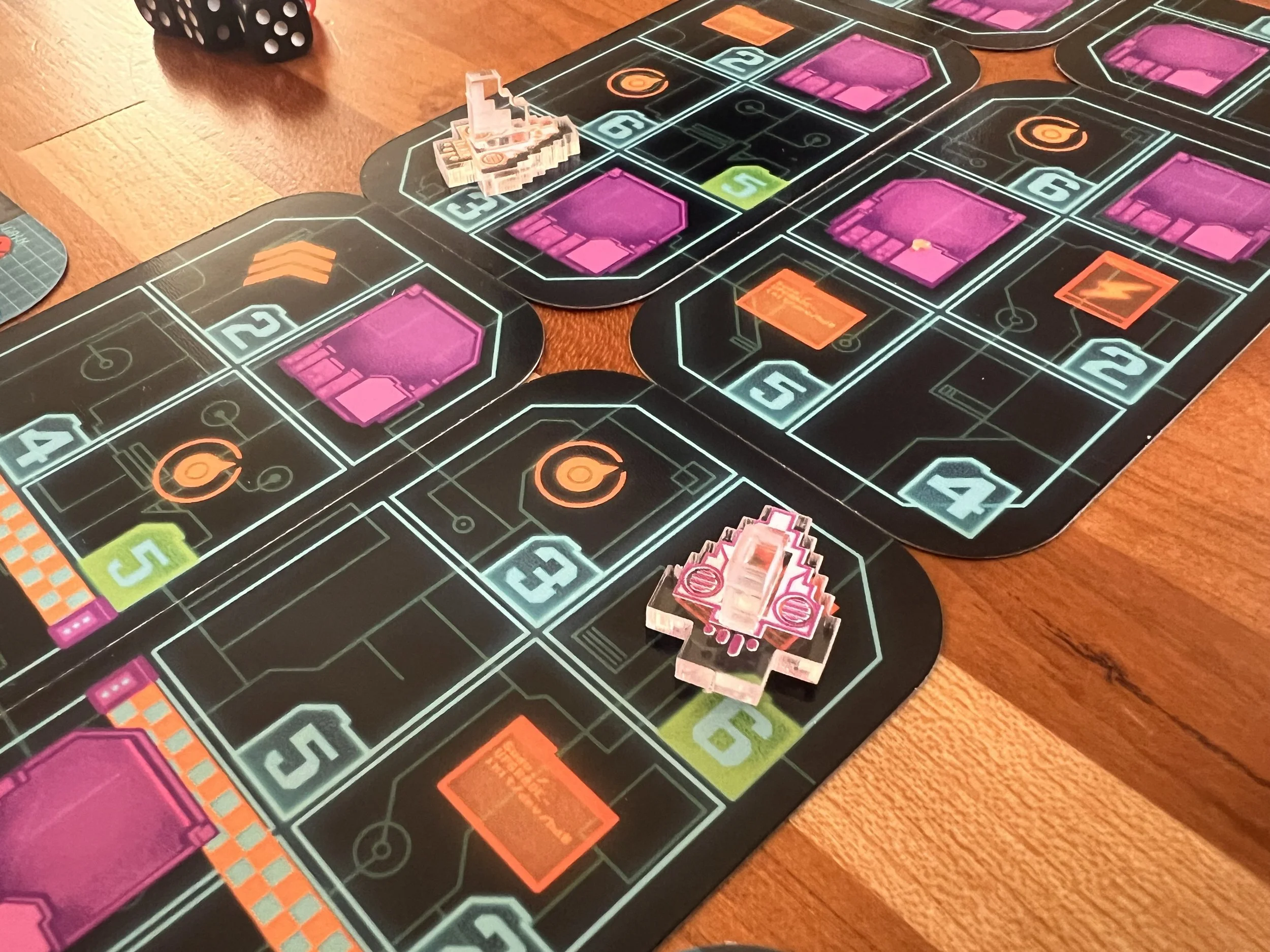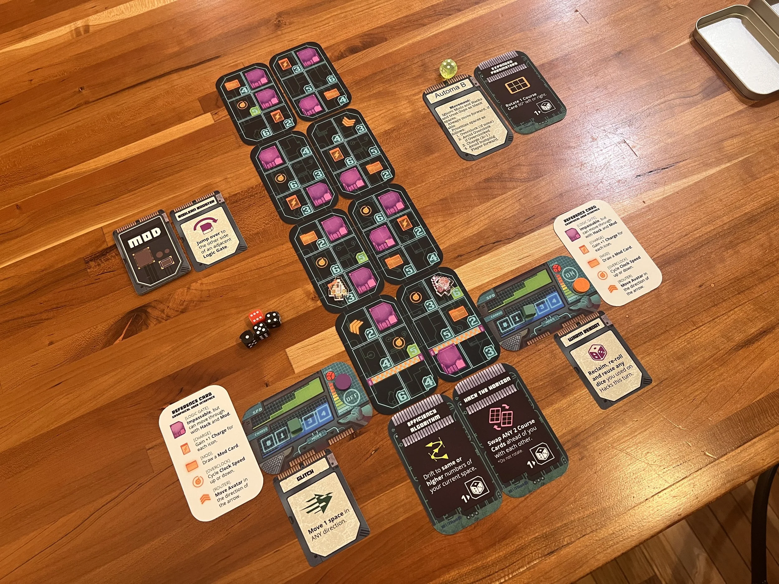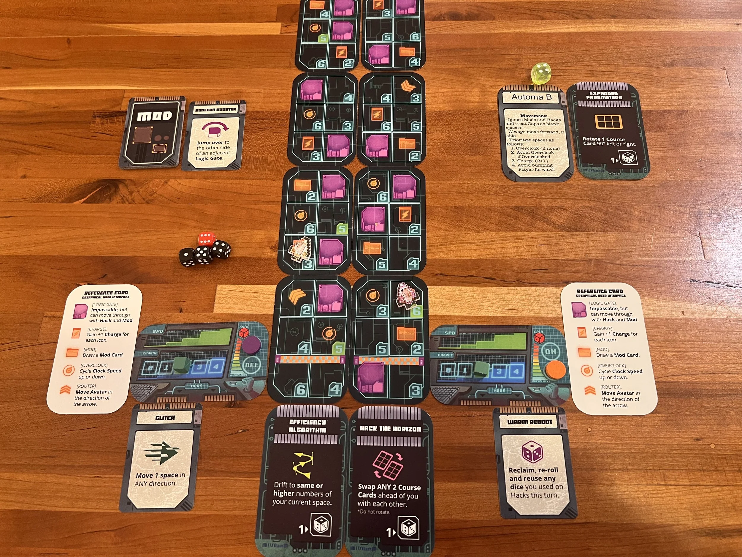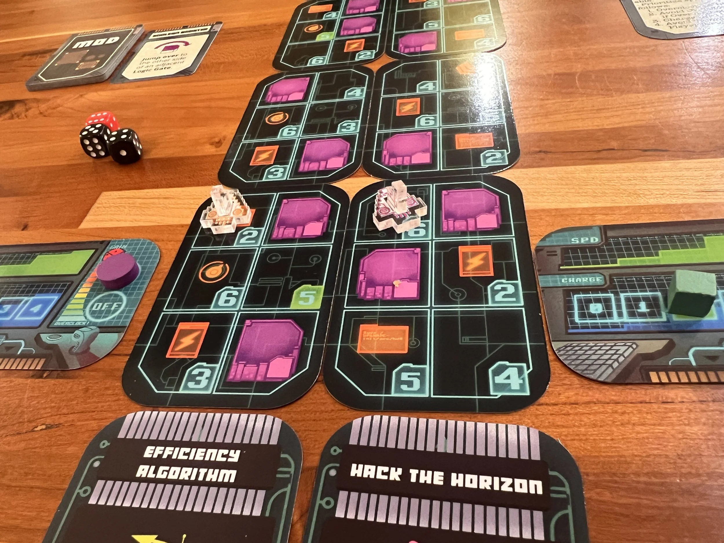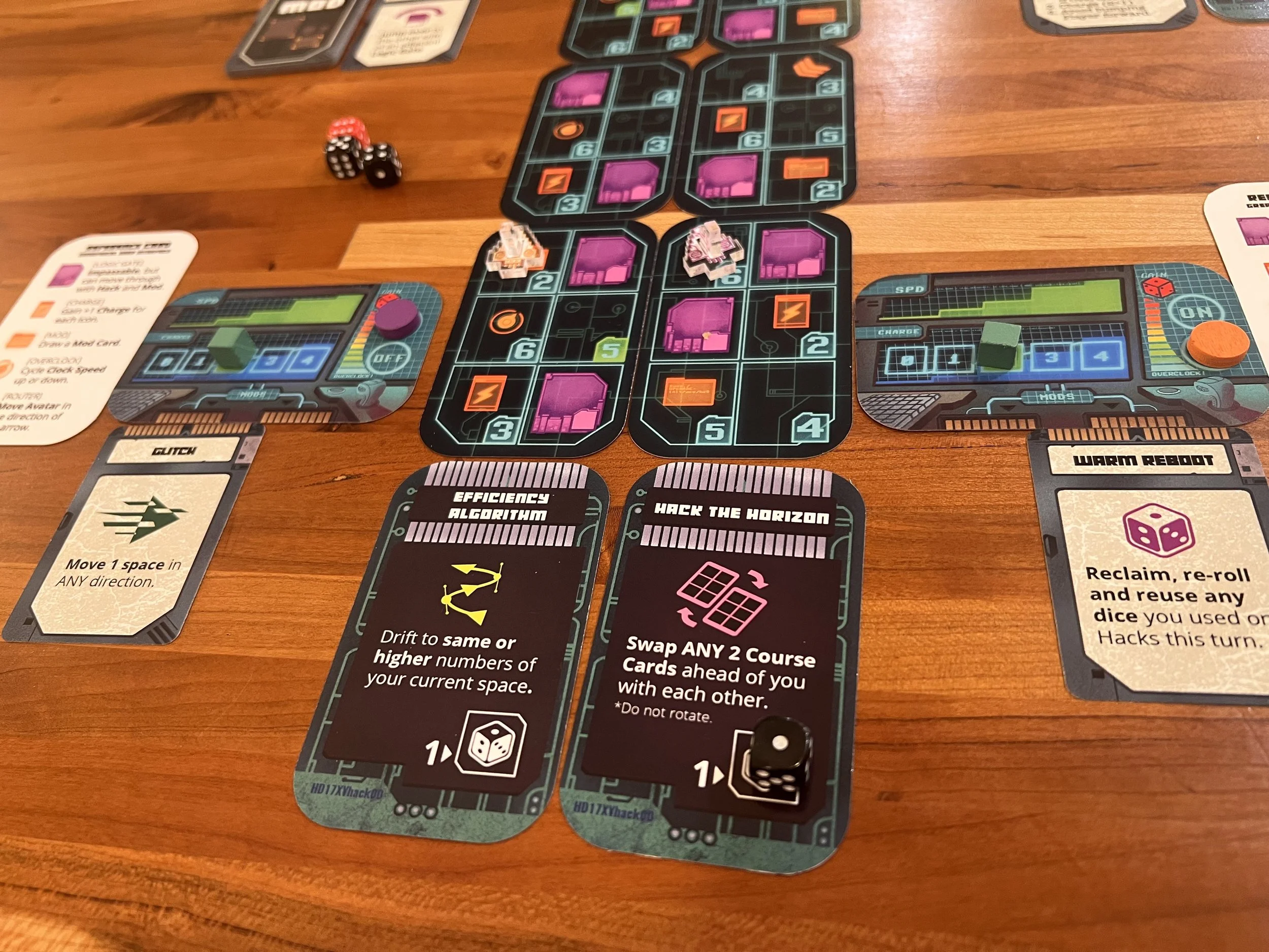 Gameplay for this one involves rolling dice and assigning the numbers to move into spaces on the track. Dice can be modified by using Energy, and spaces on the board will provide numerous benefits to be gained and obstacles to be avoided. 1's can be assigned to Hacks - powerful abilities randomly chosen at the start of the game that let you bend (hack) the rules of the digital universe. As you progress, the course cards left behind flip over and are placed at the front of the track, evolving the course as you play and eventually revealing the finish line. The player furthest past the line after an equal number of turns is the winner!