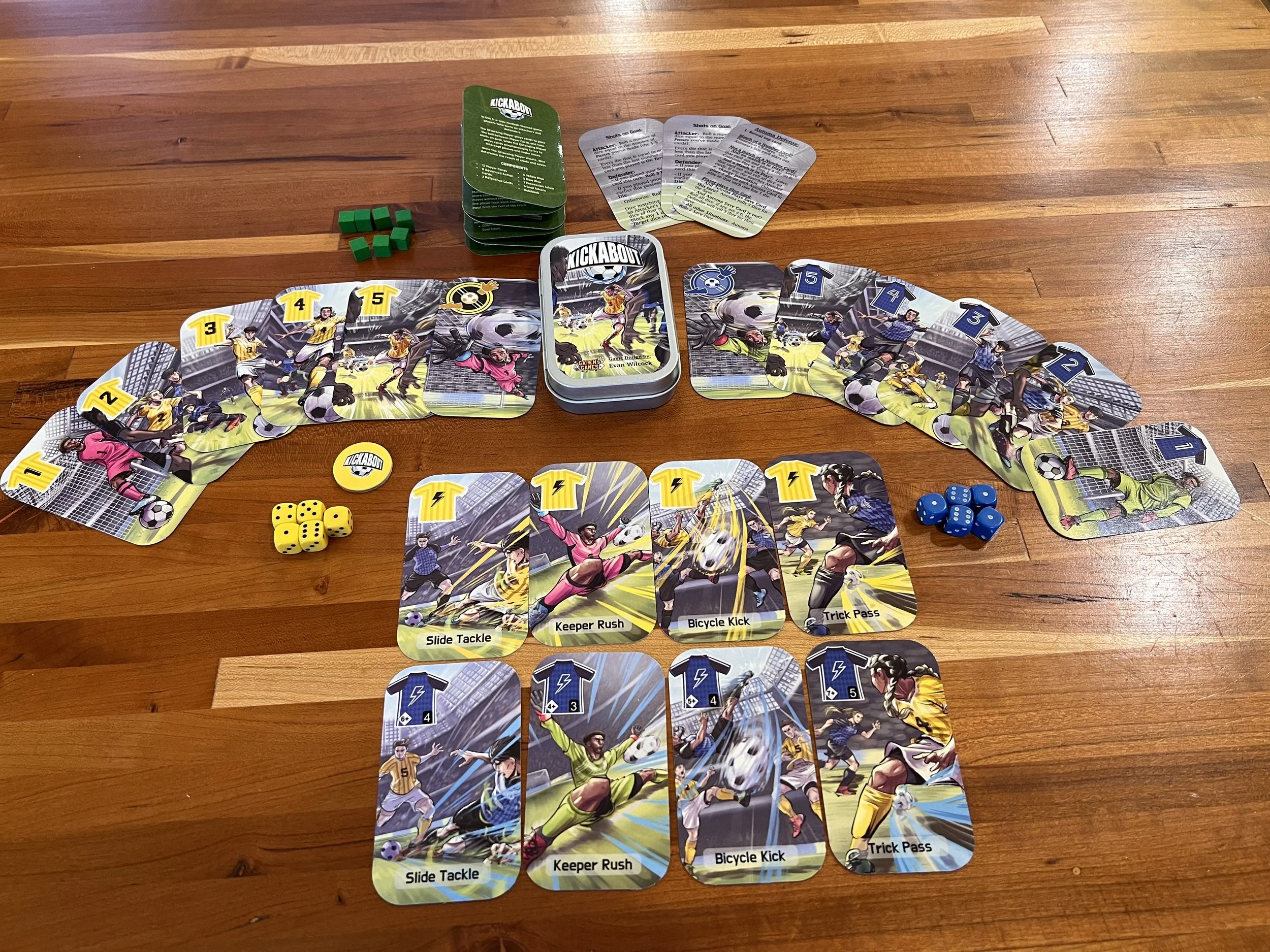 Gameplay is as simple as picking and revealing a card from your hand each turn. The Defender is trying to match the Attacker to steal the ball, the Attacker is trying to complete passes by not being matched. When the Shoot card is played, the number of completed passes determines the number of dice rolled, while the number of the last card you played determines the numbers rolled that will be "shots on goal". If any of your shots on goal get past the Defender's Dice: GOAL!