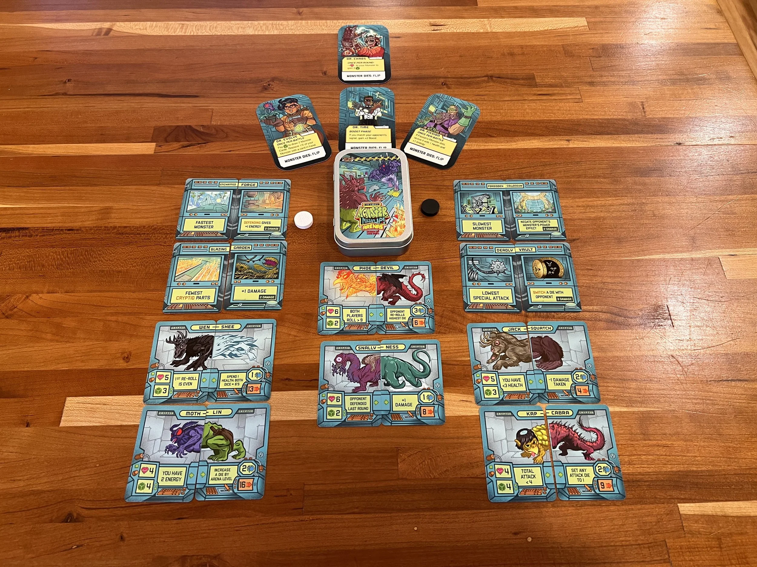 Mint-Tin Monster Mash-Up combines dice, tactics, timing, and deceit into a portable dueling game that’s easy to learn and plays in 15 minutes!