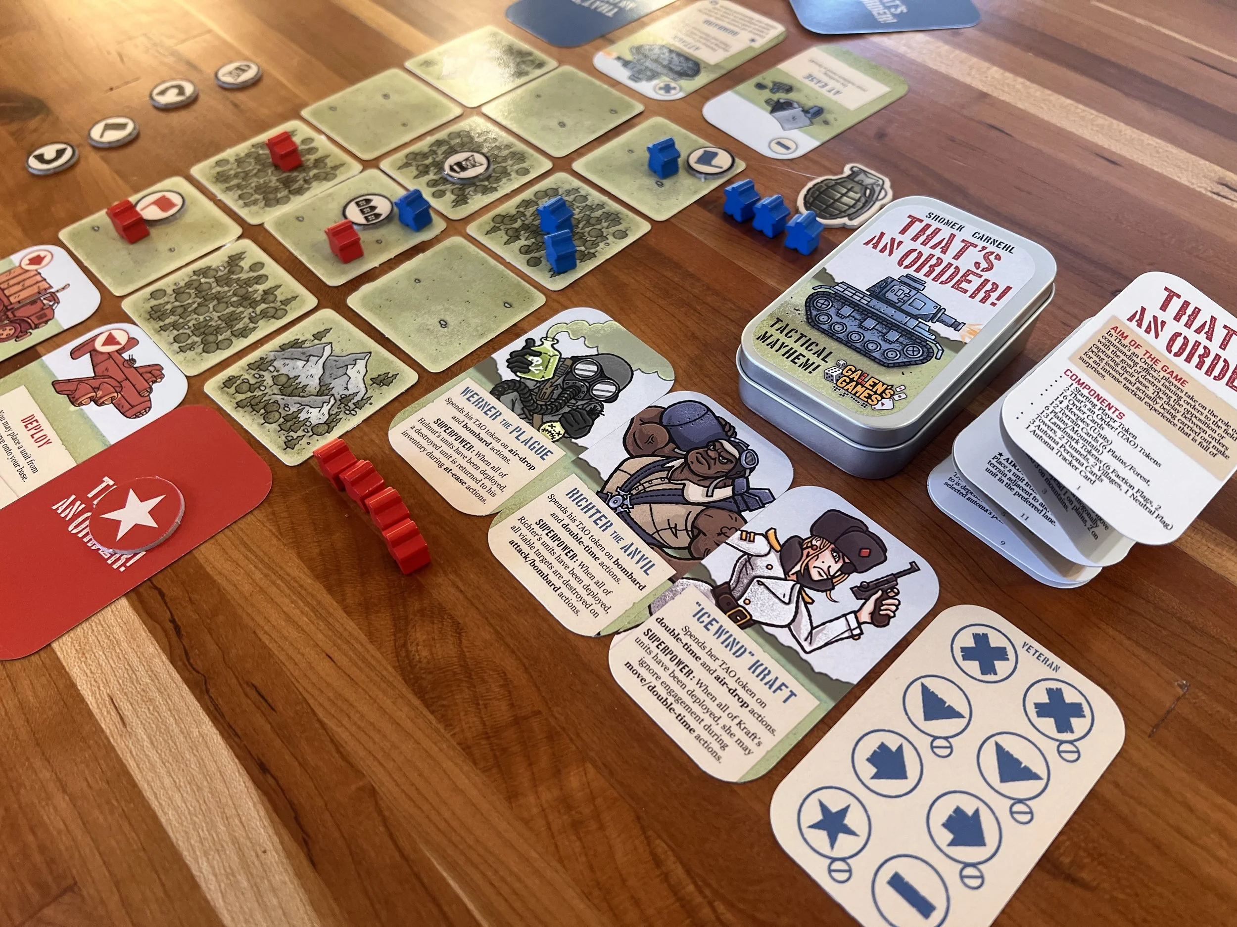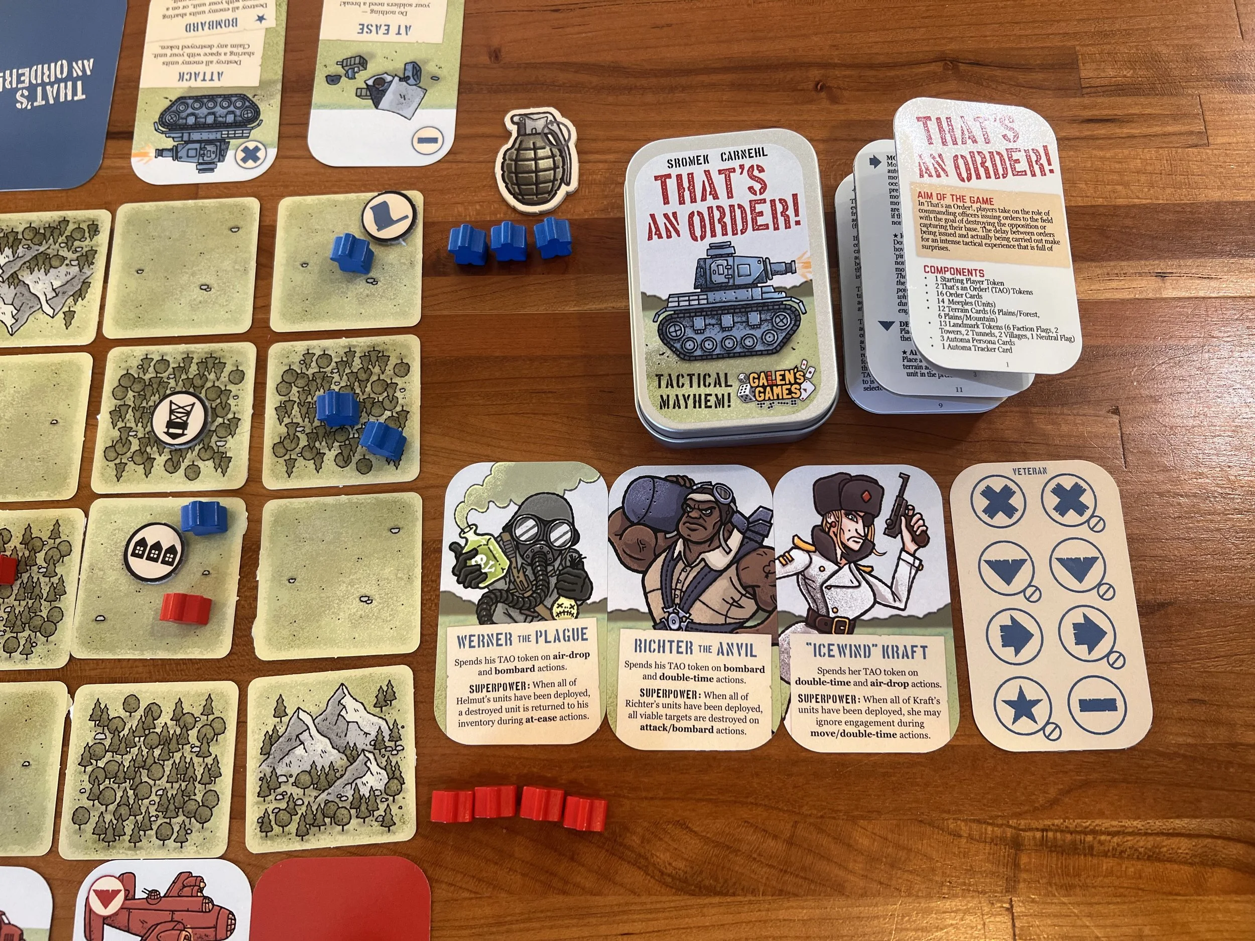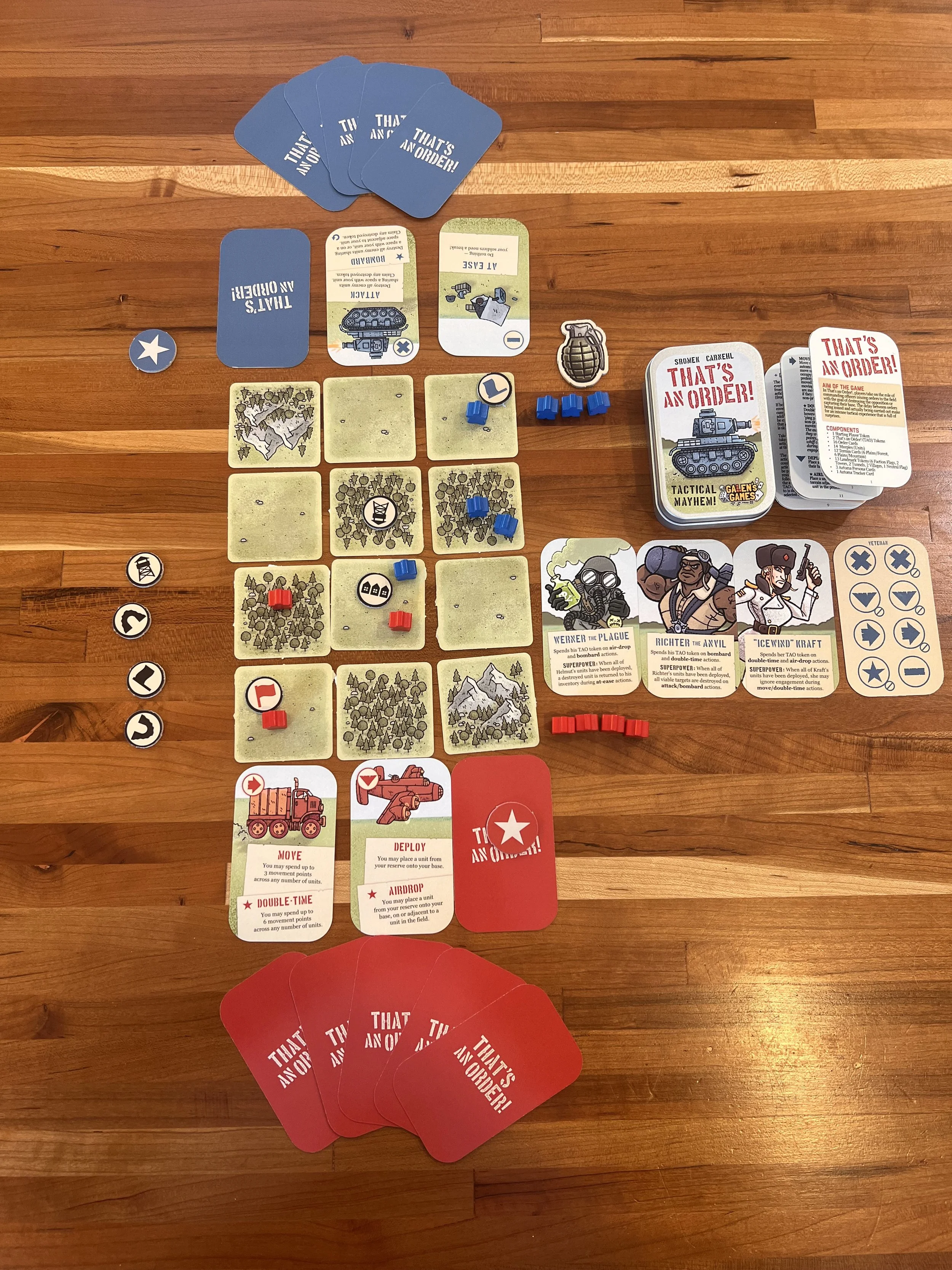 That's an Order is a mini programming game of tactics, timing, and bluffing. Set up the battlefield using a variety of terrain. Then, each player chooses their first three commands and sets them face-down in order. They are revealed and executed in alternating turns.